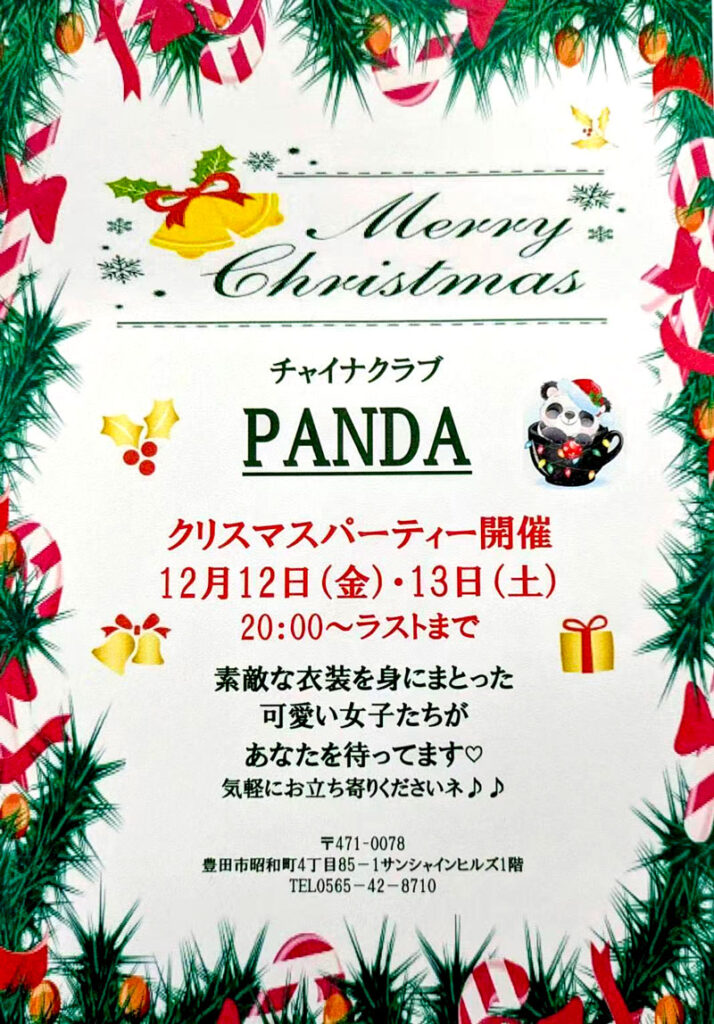 クリスマスパーティー開催 クリスマスパーティー開催! 12/12(金)~13(土)のクリスマスパーティーを開催いたします、 素敵な衣装を身にまとった可愛い女子たちがあなたを待ってます♡ お気軽にお立ち寄りくださいネ♪♪ クリスマスパーティー開催 クリスマスパーティー...もっと見る PANDAチャイナクラブ 1周年! PANDAチャイナク...もっと見る ハロウィンパーティーのお知らせ 女の子達が仮装して楽...もっと見る